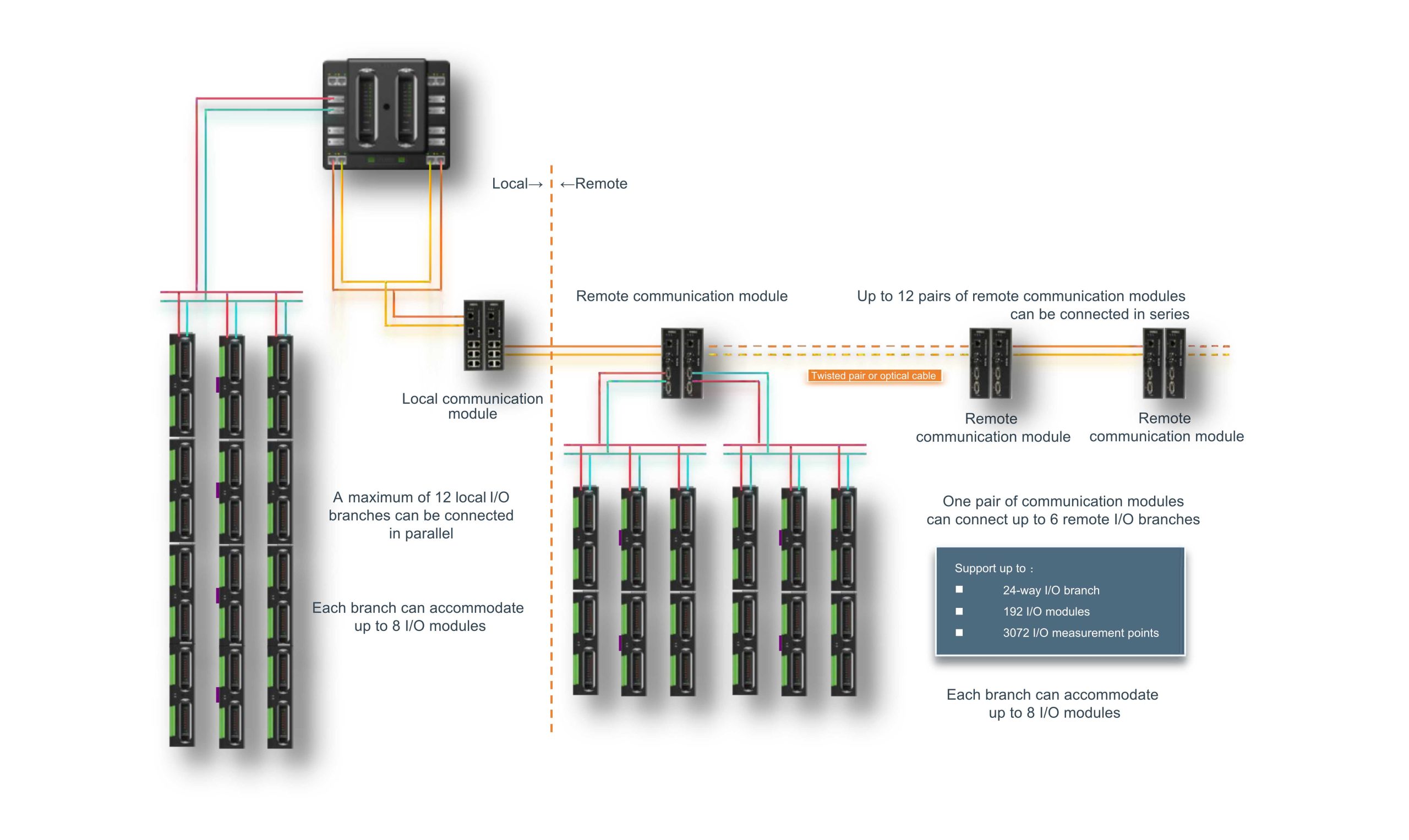 I/O modules are mounted on modular docking type I/O bases, with each base supporting two modules. Each branch accommodates up to four bases, allowing installation of up to eight I/O modules for scalable configuration.